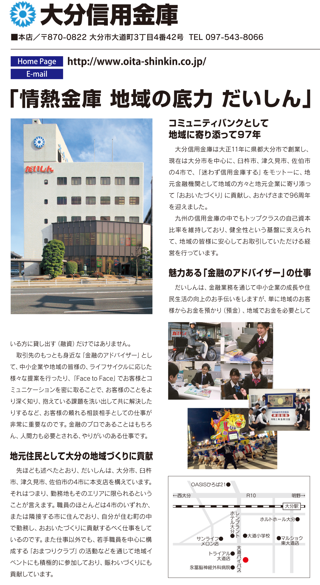 会社概要 設 立:1922年11月14日 従業員数:232名(男性114名、女性118名) 平均年齢:39才2ヶ月(男性41才1ヶ月、女性35才4ヶ月)) 事業内容:金融業(預金、融資、為替、日銀歳入代理店ほか) 事業所:本店・大分市大道町、支店・大分市16店舗、臼杵市2店舗、津久見市1店舗、佐伯市6店舗
